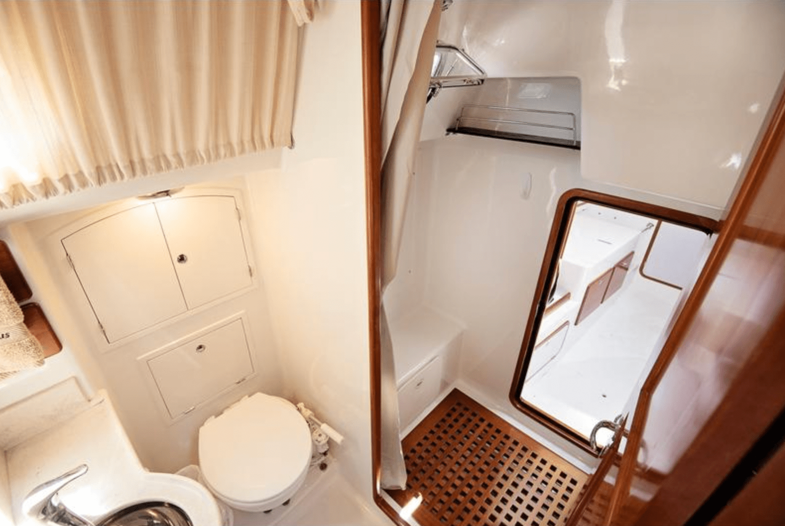 The Outbound 46 has the tankage every cruiser dreams of and it’s in exactly the right place. By putting the tanks below the floor, the weight is kept low in the boat which attributes to the boats phenomenal seakeeping habits and keeps her stiff when tanks are full. An added benefit of the location of the tanks is storage under the settees. Outbound has also designed the waste systems for the heads to be maintenance free. By utilizing a gravity feed system for discharge, long hose runs and the dreaded macerator pump is eliminated.